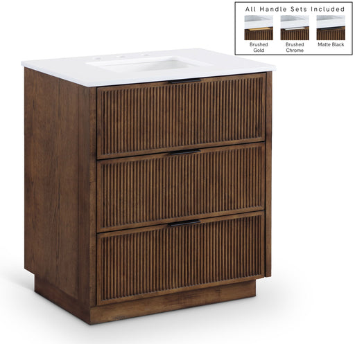 Meridian FurnitureTextured wood and a sleek white engineered stone top bring contemporary style to the Willard bathroom vanity. Complete with a full set of brushed g...