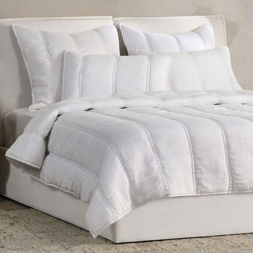 Classic HomeQuilted by hand with a large, channel-stitched design, this collection brings a crisp, airy feeling to any space. Ramie, a sustainable material, em...