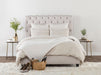 The Doheny Bed features timeless elegance with its tufted upholstered headboard and smooth fabric finish. Its sturdy frame and classic design provide both comfort and sophistication, making it a centerpiece for any bedroom retreat.