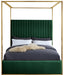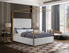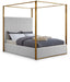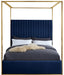 Dream big in the Jones velvet canopy bed. This handsome Meridian Furniture bed has a channel tufted headboard, giving the bed a regal and sophisticated look. The headboard is tufted for added elegance, and the bed comes with a brushed metal canopy, adding to its overall elegance and grandeur. Black velvet fabric used on the sides and headboard gives it a luxe vibe, and the headboard is heavily padded, making it an ideal backrest for reading or watching TV.