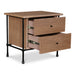 The Rene nightstand harmoniously blends traditional charm with contemporary elegance through its beveled feet and mixed material construction. Crafted from solid Acacia wood, its wire-brushed finish reveals intricate grain patterns resting atop hammered iron legs, creating a floating effect. Meticulous craftsmanship shines through wood joinery details and contrasting iron handles.