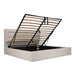 The Sebastian storage bed's double-layered headboard, featuring a tufted second layer and pillow-like front, creates a serene sanctuary. Crafted from solid wood, foam-filled, and upholstered in fabric upholstery, it promises enduring comfort. An innovative hydraulic lift system reveals discreet storage, seamlessly blending functionality with sophistication; every detail speaks to understated luxury and practical sensibilities.