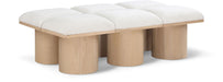 Bring valuable seating and remarkable style to your space with this Pavilion boucle fabric bench, an exquisite balance of style and usability for the entryway, bedroom, and beyond. Crafted from oak veneer with a natural finish, this bench has a 4-inch-thick seat cushion that's channel-tufted for a touch of luxury. The bench's columnar bases add a dash of art deco design, making it a captivating focal point in any room.