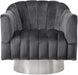 Relax and unwind in this Farrah velvet chair. A beautifully modern design with hints of retro flair epitomize this lovely chair, which rests on a stainless steel base that's finished in for a sleek, modern touch. The velvet upholstery gives the chair a sumptuous look, while beveled tufting lends it a plush, welcoming feel and keeps the foam inside aloft. For added fun, the chair swivels from side to side.