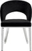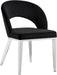 Seat dinner guests in elegant style with the Roberto velvet dining chair from Meridian Furniture. This fabulous chair features a rounded back with strategically placed opening for visual beauty and to allow air flow while you dine. The rich upholstery is chic and modern, and it has a soft feel against the skin. This chair rests on iron legs for superb support, and each leg is finished in for a modish slant that meshes well with your up-to-the-minute dining room decor.