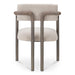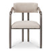 The Cassidy dining chair's wishbone silhouette features a double-beamed back flowing into the arms, creating an inviting embrace. Upholstered in easy-to-clean performance fabric, it offers a cocoon of comfort, while the blackened bronze frame adds contrast. Dark brown leather-wrapped armrests develop a rich patina over time.