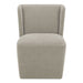 The Cormac rolling dining chair is all about comfort with a generously padded seat and backrest, a slight curve of the back and caster wheels that effortlessly glide across the floor. Crafted from high-performance fabric that is soft to the touch yet resilient against stains, spills, and daily wear.