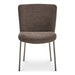 The Early dining chair is an elegant fusion of minimalist design and comfort that features a slim metal frame in a blackened bronze finish. Its seat and comfortably curved back are upholstered in soft fabric. It complements any dining setting, especially alongside wooden tables, presenting a clean, cohesive look that invites sophisticated ease.