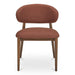 The Ellie dining chair features a padded winged backrest, a refined invitation to gather. A robust rubberwood frame bathed in a dark espresso brown finish harmonizes with the rustic, rust, easy-to-clean performance fabric upholstery, adding a vintage charm with modern convenience--a versatile design that complements a myriad of interior styles.