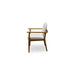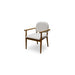 The Norrie dining chair features a continuous frame that flows seamlessly from back to armrests. Crafted from robust rubber wood and upholstered in soft fabric, these chairs exude sophistication as the clean lines make them versatile for various dining settings.