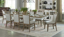 This stunning set is designed to accommodate groups of varying sizes with its expandable table top, making it perfect for large family gatherings or intimate dinner parties. The fashionable apron of the table reflects vintage influences, adding and extra touch of style to your dining room. with the included 24" leaf, the table comfortably seats 6-8 people and can expand to seat up to 10, ensuring that everyone has a place at the table. The trestle-style base of the table adds drama and substance, making a statement in any dining room. Two chairs fit comfortably between each trestle base support, allowing for ample leg room and ensuring that everyone at the table is comfortable. The chairs are upholstered in a neutral, textural, multi-tone fabric that complements all furnishings, ensuring that this set will look beautiful in any dining room. The chairs are designed with comfort in mind, allowing you to sit back and enjoy your meal in style. Whether you're hosting a holiday feast or a casual dinner party, this set will make your dining room the perfect gathering place for years to come.
