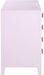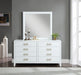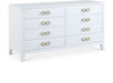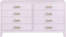 Bring unique elegance to your bedroom with this Bowtie dresser from Meridian Furniture. This dresser features eight drawers, providing you with plenty of storage space for clothes, linens, or miscellaneous objects. Its light color adds a touch of femininity to your living space, and its brushed bow tie handles complement your existing decor. Its flat top is perfect for placing a lamp, framed picture, books, bric-a-brac, and more.