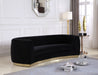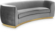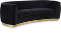 The perfect mix of velvet and stainless steel comes to life in your space with this Julian Sofa. This bold velvet sofa comes upholstered in rich, sumptuous-to-the-touch velvet to make a fashionable statement in your space. The curved back design lends it a modish touch, and the stainless steel trim around its base adds to its glitzy appeal. Stage this sofa alone or with other pieces in the Julian collection.