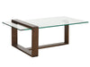 In a striking modern example of mixed materials, Bristow creates chic sophistication. Smooth, sleek glass tops are supported by Acorn finished Mindi wood interlocking rectangles and are punctuated with metal pucks. A chunky wood rectangle overlaps the top at one end as the other understated rectangle base rests underneath on the conversation worthy cocktail, impressive open sofa table and the rectangular end table with geometric appeal that delightfully complement contemporary living spaces.