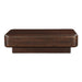 The Eton coffee table is a study in contrasts, marrying bold geometry with gentle curves. Crafted from rich Acacia wood, the substantial top appears to float above a recessed base, creating visual intrigue. Each piece showcases unique grain patterns through its thoughtful design and natural beauty as its dark brown finish matures the overall look.