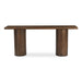The Hadley console table showcases the natural beauty of reclaimed neem wood with understated elegance. Its minimalist design features a substantial 2-inch-thick rectangular top resting on robust cylindrical bases. Each piece tells a unique story through subtle variations, a testament to the wood's previous life.