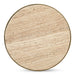 The Holli side table blends timeless travertine with sleek iron, as its organic top rests within a subtle metal rim. The antique gold base, featuring gentle curves and distinctive buckle-like detail, showcases meticulous craftsmanship in a timeless hue.