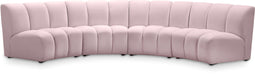 Create a seating group that works for every possible situation with this Infinity modular 4-piece sectional and other pieces in the Infinity collection. Upholstered in soft velvet material that feels great against the skin and offers long-wearing beauty, this piece fits with other Infinity items for an infinite number of combinations that get your seating requirements just right but that look just as nice when used on their own.
