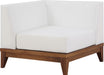 Create the outdoor living group of your dreams with this Rio outdoor off-white water resistant fabric modular corner chair. Designed for seamless integration between every item in the Rio collection, this chair features construction with premium materials, including solid acacia wood, so you can count on it lasting for many seasons into the future. The contemporary design makes this unit a great addition to your outdoor entertaining setup.