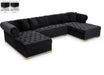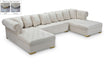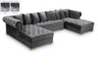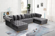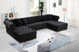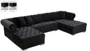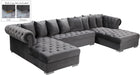 Get ready to relax after a long day with this Presley Sectional from Meridian Furniture. Featuring rich velvet upholstery with deep tufting and comfy pillows, this double chaise sectional provides a luxurious, cozy space to kick back and watch TV, take a nap, or curl up with a nice book. Complete sets of and legs complement your contemporary home decor while providing solid support for the sectional's frame.