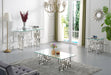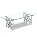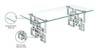 Enjoy a contemporary look in your living room or den with this stylishly elegant Alexis chrome table. This Meridian Furniture table is made from glass and metal for a sleek, modish look. The base features a geometric design with intertwined squares that form two pedestals. The top is crafted from thick, clear glass that allows the beauty of the base to shine through completely. A chromed finish shores up the design, adding to its up-to-the-minute feel.