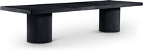 Seat guests in style when they gather around this Belinda black oak dining table. From simple suppers with the gang to more elaborate meals with family and friends, this table is amply sized to seat them all with oodles of elbow room to spare. The rich black finish gives the table a contemporary edge while a mix of solid wood and MDF ensures lasting stability. Resting on two fluted bases, this table offers the perfect mix of simple and elegant for your modern dining room.