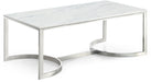Lend your living room or den a modern slant with the Copley coffee table from Meridian Furniture. This coffee table features geometric bases, and a sleek chrome finish that gives your space a bold, up-to-the-minute look. Each table has a solid stone top for durability and style.