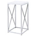 This the modern accent table oozes luxury and offers a sophisticated update to a simple silhouette. Decorated with X-shape details, the base is constructed of sleek lines in a bright, metallic finish. Dress up any living or sitting area with the crisp and glossy white finish of the square top. Create an open feel with the airy legs and shiny hues, perfect for adding depth. Display your favorite vase in style over cross hatched details.