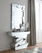 Elevate your interior with this Jade console table. This handsome table features a staggered geometric base that makes it look more like an intricate sculpture than the actual piece of furniture it is. Every surface of the base is mirrored, so it reflects light and adds spacious appeal and dimension to your space. The top is made from thick glass and amply sized to hold collectibles or photos.