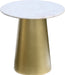 Entertain friends in sophisticated style around this Sorrento table. The round shape ensures everyone can see and hear each other in conversation. The genuine marble top helps prevent damage from cups, dishes or other items being pushed or placed on the table. The cone-shaped brushed gold base gives the top a sturdy foundation while the illustrious color wows guests who see it. The base is large enough to ensure cups at the edge can't fall off. Place this beautiful table in your favorite space with chairs around it and enjoy good company.
