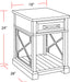 An elegant reflection of the rustic beauty found in America's greatest landscapes, this beautiful Chairside Table from the Sundance collection makes a smart addition to any seating area. Its classic profile is highlighted with a hand-applied, multi-step finish and features decorative X-shaped crossbars and a bold drawer pull. Look below and find an open shelf ideal for storing books and magazines. You'll love how its Power Center with dual AC outlet and dual USB port makes it easy to keep your electronics charged and close at-hand.