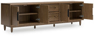 Introducing a TV stand inspired by the architectural language of mid-century expression. Its spacious cabinets and drawers provide ample storage, while a sleek design allows the natural beauty of the wood to shine through. Ready for a cinematic experience? This entertainment center is perfect for movie nights and relaxation.