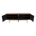 A simple design that packs a punch. Dark stained walnut veneer accompanies black corduroy wood detailing on the Araya Sideboard cupboards. This mid-century modern sideboard's large storage compartment opens to reveal four large shelves, ideal for storing your favorite board games and consoles.