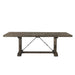 The Finn Dining Table is dressed in a distressed dark walnut finish, making it the perfect addition to any dining room. This handsome trestle style table features a removable leaf for added space. Turnbuckle metal accents complete the look of this rustic chic table.