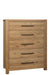 Made in the USA from solid American White Oak; this chest with five drawers; shown in an oak finish; offers a casual style to any bedroom in your home. It features a distinctive exposed tenon joint at the top and bottom.