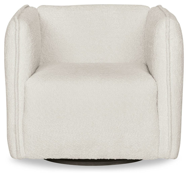 Take clean-lined comfort for a spin with this swivel accent chair. Its neutral upholstery is made deliciously dramatic by flange welting and a boucle-like weave. With 360-degree swivel motion, this chair merges forward-thinking function with a contemporary aesthetic.