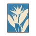 The Paradis framed painting captures the vibrant essence of the bird of paradise flower through its expressive shape and bold angular form. Set against a solid, rich blue background, the artwork's textured paintwork creates a striking inverse silhouette, where bright light plays the defining role instead of dark shadow.