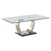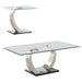 Transform your living room with this modern coffee table set, featuring tempered glass tops for durability and a clean, sophisticated look. The coffee table showcases dual curved bases, while the end table features a single curved base, both in a brushed satin silver finish. Polished black platform bases provide stability and contrast, making this set an ideal addition to minimalist or contemporary interiors.