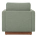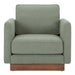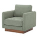 The Vernon accent chair blends mid-century design with modern functionality. It features a wooden plinth base for an elevated, lighter appearance. This chair offers unmatched comfort with removable cushions. Upholstered in durable, OEKO-TEX and Green Guard-certified fabric, it is ideal for family living, combining everyday practicality with durability.